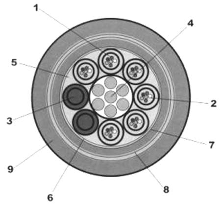 Рис. 2.1. Конфигурация оптоволоконного кабеля (на примере оптического городского кабеля производства фирмы Fujikara для прокладки в кабельной канализации, трубах, блоках, коллекторах, на мостах и в кабельных шахтах): 1 – оптическое волокно; 2 – внутримодульный гидрофобный заполнитель; 3 – кордель; 4 –центральный силовой элемент – стальной трос; 5 – гидрофобный заполнитель; 6 – скрепляющая лента; 7 –промежуточная оболочка из полиэтилена; 8 – броня из стальной гофрированной ленты; 9 – защитная оболочка из полиэтилена.