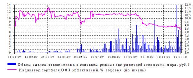 Эффективный индикатор рыночного портфеля ОФЗ, рассчитываемый Банком России, по итогам 2009 года снизился на 47 базисных пунктов (б.п.) до 8,64% годовых.