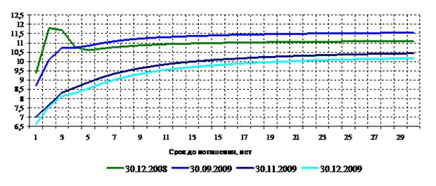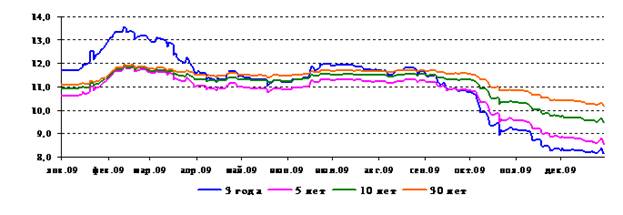 В 2009 году кривая бескупонной доходности сместилась вниз (в среднем на 150 б.п.) по всем временным сегментам. Наиболее существенно она сместилась по выпускам ОФЗ со сроками до погашения от 2 до 3 лет (на 422 и 354 б.п. соответственно).
