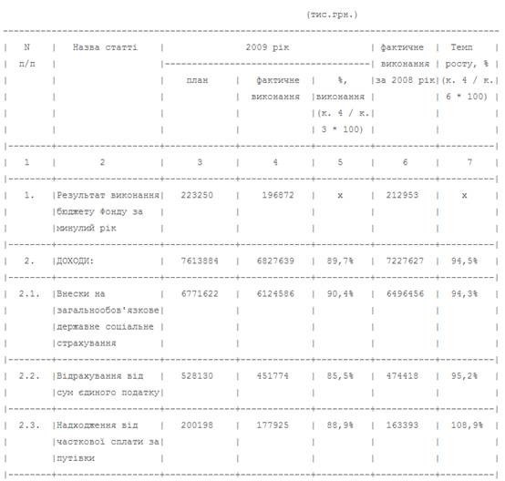 Якщо загальний фонд оплати праці найманих працівників і грошового забезпечення військовослужбовців очікувався у 2009 році на рівні 313 млрд.грн., то фактично він склав 285,7 млрд. гривень. За даними фінансового звіту за 2009 рік не виконано планові показники по доходах всіма відділеннями Фонду. Лише у Миколаївському обласному відділенні Фонду бюджетний показник за статтею "Внески на загальнообов'язкове державне соціальне страхування" виконано на 100,6%. Найгірші показники у Київському міському відділенні Фонду - 85,0% до плану, Донецькому - 86,6%, Запорізькому - 87,3% та Дніпропетровському - 88,5% обласних відділеннях Фонду.