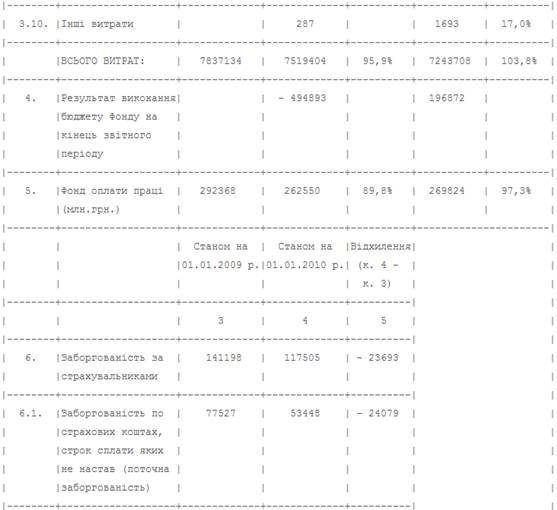 Заборгованість за Фондом станом на 01.01.2010 року становить 604,9 млн.грн., що на 363,5 млн.грн. або у 2,5 рази більше порівняно з даними на початок 2009 року. Найбільше зростання заборгованості за Фондом протягом поточного року спостерігається у Рівненському (5,8 р.), Житомирському (5,1 р.), Чернівецькому (4,6 р.) та Дніпропетровському (4,6 р.) обласних відділеннях Фонду. Витратна частина бюджету Фонду за 2009 рік становить 7519,4 млн.грн. (95,9% до плану) або 103,8% до даних 2008 року. Фактичні витрати на виплату всіх видів допомоги за звітний період становлять 5477,2 млн. гривень. З урахуванням резерву страхових коштів планові показники на їх виплату виконані на 95,8 відсотка.
