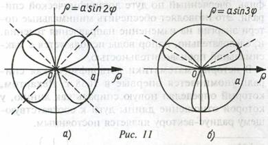 Наиболее красивые «цветы» получаются при k = 2 (четырехлепестковая роза) и при k = 3 (трехлепестковая роза, хотя читателю, обратившему внимание на рис. 11,б, может показаться, что эта кривая больше напоминает пропеллер).