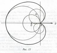 Сначала выберем опорную окружность и ее радиус ОА примем за 1, а прямую ОА — за ось абсцисс, причем точка А произвольно выбирается на опорной окружности. Проведем другую окружность с центром в точке М, произвольно взятой на опорной окружности, и радиусом МА. Повторив затем такие построения для достаточно большого числа точек М, равномерно распределенных по опорной окружности, увидим, что огибающая всех окружностей радиуса МА и есть кардиоида (рис. 13).