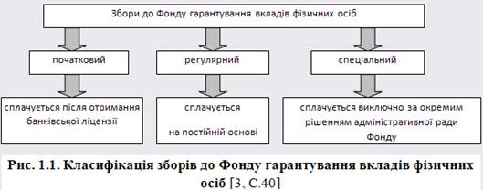 Збори в Фонд гарантування вкладів фізичних осіб передбачені в з 2001 року. Встановлення і скасування спеціального збору до Фонду гарантування вкладів фізичних осіб, розмір та механізм справляння цього збору здійснюються відповідно до Закону України від 20 вересня 2001 року № 2740-ІІІ "Про Фонд гарантування вкладів фізичних осіб". Цим Законом передбачені три види зборів (рис. 1.1.). Механізм сплати кожного із цих зборів показаний у Додатку А.