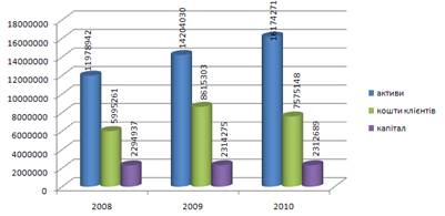 Отже, з графіка чітко видно зростання активів Банку з 1197942 тис. грн. у 2008 році до 16174271 тис. грн. у 2010 році. Протягом 2009 року клієнти активно вкладали свої кошти в банк, про що свідчить збільшення цих коштів від 5996261 тис. грн. до 8615303 тис. грн. Проте у 2010 році бачимо певний спад – коштів клієнтів банку стало 7575148 тис. грн. Власний капітал залишається майже незмінним протягом 2008-2010 рр., але можемо відмітити, що, як і кошти клієнтів, капітал банку збільшився у 2009році та трохи зменшився у 2010 році. З цього можемо зробити висновок, що Банк успішно здійснює свою діяльність – нарощує активи, залучає кошти клієнтів.