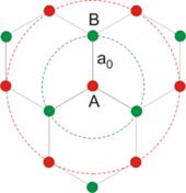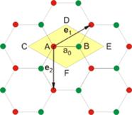 (без множителя 2π). В декартовых координатах положение ближайших к узлу подрешётки A (все атомы которой на рисунке 3 показаны красным) в начале координат, атомов из подрешётки B (показаны соответственно зелёным цветом) задаётся в виде: