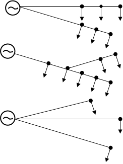- радіальні розімкнені мережі, що складаються з ліній, кожна з яких живить окреме навантаження або окрему групу близько розташованих споживачів;