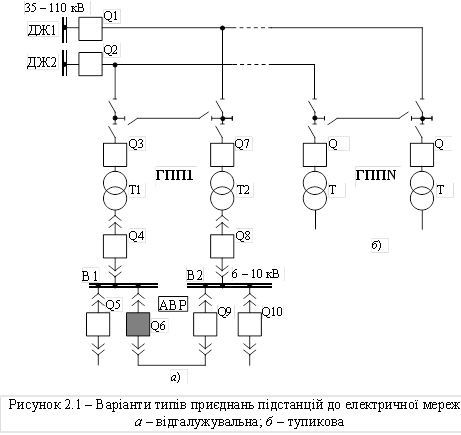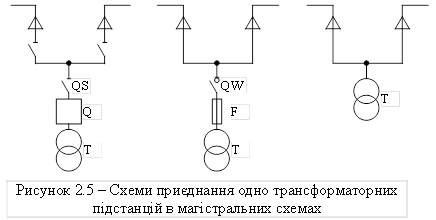 Основні схеми приєднання однотрансформаторних ПС в магістральних схемах наведені на рис. 2.5.