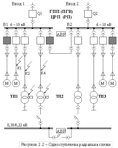 Перевагою радіальних схем є висока надійність електропостачання. Так, вихід із ладу однієї лінії (точка КЗ К1 на рисунку 2.2) не впливає на роботу споживачів, що живляться від інших ліній.