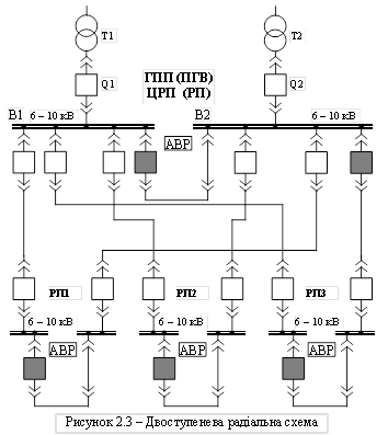 Двоступеневі радіальні схеми застосовують на великих і середніх підприємствах з цехами (групами цехів), які розташовані на великій території. Живлення розташованих поруч одно та двотрансформаторних ПС без шин ВН та ЕП з напругою понад 1 кВ здійснюється від проміжних РП (РП1 – РПЗ), що живляться від ГПП радіальними лініями першого ступеня (рис. 2.3). При цьому всі комутаційні та захисні апарати розміщуються на РП (див. рис. 2.2). На цехових ТП передбачається глухе приєднання трансформаторів до радіальних ліній другого ступеня. Це дуже спрощує конструкцію та зменшує габарити ТП, що має велике значення при застосуванні внутрішньоцехових ТП.