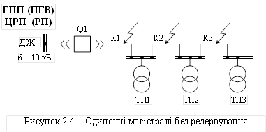 Одиночні магістралі без резервування (рис. 2.4) застосовуються для живлення ЕП 3-ї категорії лише в нормальному режимі. У разі аварії на кожній ділянці магістралі (точки КЗ К1, К2 чи К3) під дією РЗ вимикається вимикач Q1 і усі ТП припиняють електропостачання споживачів на час пошуку та полагодження пошкодженої ланки магістралі.