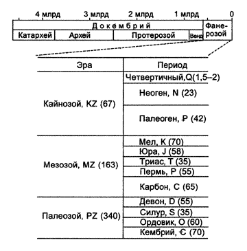 Интересно, что этот эволюционный период оказался наиболее продолжительным, заняв едва ли не 85% времени всей биологической эволюции. Так, если самые древние одноклеточные организмы появились приблизительно 3, 5 млрд лет назад, а Земля образовалась за 1–1, 5 млрд лет до возникновения первых устойчивых форм жизни, то все многообразие живой природы сформировалось в кембрийском периоде палеозойской эры, т.е. 530–540 млн лет назад и за исторически короткий по сравнению с предыдущими архейской и протерозойской эрами срок в 5–10 млн лет.