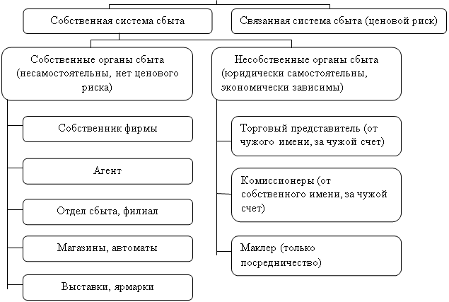 1) Отдел сбыта – традиционная структура, осуществляющая функции формирования и исполнения заказов на поставку товаров. В современных условиях на большинстве предприятий эти отделы входят в состав службы маркетинга. Отдел сбыта может иметь агентов (лиц, которые на основе договоров, заключаемых с производителем, оказывают содействие в реализации произведенных им товаров) и коммивояжеров (сотрудников предприятия, которым поручается поиск потребителей и работа с ними).