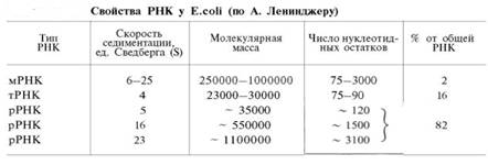 О количестве РНК нет точных данных, поскольку содержание ее в разных клетках в значительной степени определяется интенсивностью синтеза белка. На долю РНК приходится около 5–10% от общей массы клетки. Современная классификация различных типов клеточной РНК основывается на данных топографии, функции и молекулярной массы. Выделяют три главных вида РНК: матричную (информационную) – мРНК, которая составляет 2–3% от всей клеточной РНК; рибосомную – рРНК, составляющую 80–85% и транспортную – тРНК, которой около 16%. Эти 3 вида различаются нуклеотидным составом и функциями (табл. 1).