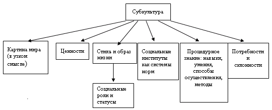 Поэтому, по нашему мнению, составляющими субкультуры и одновременно признаками ее оказываются: знание (картина мира в узком смысле); ценности; стиль и образ жизни; социальные институты как системы норм; процедурное знание (навыки, умения, способы осуществления, методы); потребности и склонности (см. схему)(15).
