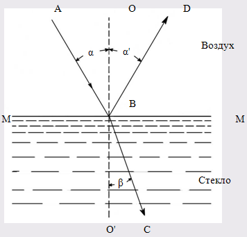 Линия ММ на рис. 1 изображает поверхность (границу) раздела между воздухом и стеклом. Падающий луч монохроматического света (света, условно одной длины волны) составляет с нормалью О\О’ к поверхности раздела сред угол АВО = α. Этот угол называется углом падения луча. В другой среде луч составляет с нормалью угол преломления О’ВС = β.