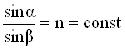 Если изменять угол падения луча α, то будет изменяться и угол преломления луча β, но при этом всегда будет сохраняться неизменным отношение синуса угла падения луча к синусу угла преломления: