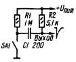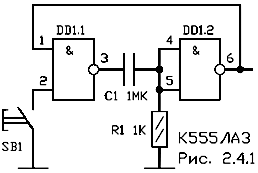На рис. 1.2,а - рис. 1.2,б приведены схемы подавления дребезга контактов, применяемые в устройствах выполненных на КМОП микросхемах. Первая из них формирует короткий импульс отрицательной полярности длительностью около 0,7 мкс на уровне 0,5 В в момент первого замыкания контактов кнопки. При этом конденсатор С1 быстро заряжается через резистор R2, и дальнейший дребезг контактов не влияет на выходное напряжение, так как разряжается он через резистор R1 большого сопротивления. Вторая используется, когда необходимо получить выходной импульс длительностью, равной продолжительности нажатия на кнопку. Колебания напряжения на резисторе R1, здесь сглаживает цепь R2,C1, резистор R1 служит для быстрой разрядки конденсатора C1.