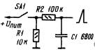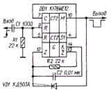 На рис. 1.4.2 приведена схема одновибратора на D-триггере КМОП микросхемы. Он запускается или коротким им пульсом по входу S, или положительным перепадом по входу С. Уровень 1 появляющийся при этом на прямом вы ходе триггера (выход 1) начинает заряжать конденсатор С1 через резистор R1. Когда напряжение на конденсаторе достигает порогового значения для входа R, триггер переключается в исходное состояние Диод VD1 ускоряет разрядку конденсатора и возвращение устройства в исходное состояние (во многих случаях он может быть исключен) Длительность импульса одновибратора определяют по той же формуле, что и для дифференцирующей цепи фильтра. Так например при С=100мкф и R=1М, длительность импульса будет около 80С, при С=100мкф и R=390К - 40С, при С=10мкф и R=560К - 5С, при С=0,68мкф и R=2,7М - 1.5С. Для частоты 2кГц можно выбрать С=,015мкф и R=11К, для частоты 450Гц - С=0,022 и R=11К, для частоты 2Гц подойдет С=0,15мкф и R=1М.