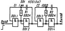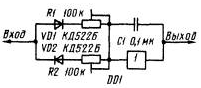 Устройство задержки импульсов изображенное на рис. 1.3,а также может использоваться для подавления дребезга. Время задержки фронтов и спадов импульсов здесь составляет 0,7R1C1. Если длительность импульсов меньше этого значения, они через это устройство не пройдут. Вариант устройства по схеме на рис. 1.3,б позволяет отдельно регулировать задержку фронта (резистором R1) и спада (R2) импульсов.