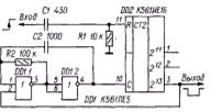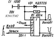 Описанным здесь одновибраторам, присущ недостаток: при включении питания они формируют на выходе импульс неопределенной длительности, однако не превышающий длительности импульса, на который он рассчитан. Если же длительность запускающего импульса не превышает половины периода задающего генератора, то пусковая дифференцирующая цепь не нужна. Одновибраторам присуще также свойство перезапуска, аналогичное микросхемным одновибраторам К155АГЗ, К555АГЗ, КР1561АГ1: если во время формирования выходного импульса появляется очередной запускающий, отсчет длительности формируемого импульса начнется заново от последнего запускающего. При отсутствии специализированных микросхем К155АГ1, К155АГЗ одновибратор можно собрать на основе триггера микросхемы К155ТМ2. Здесь по фронту входного сигнала, формируется короткий положительный импульс, как только напряжение на входе R триггера снизится до уровня лог. нуля, формирование импульса прекратится и триггер переключится в нулевое состояние ожидая прихода следующего импульса.