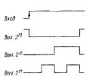 Одновибратор, выполненный по схеме, приведенной на рис. 1.4.3,а, работает следующим образом: в исходном состоянии устройства на выходе счетчика DD2 присутствует напряжение высокого уровня, запрещающее работу генератора, собранного на элементах ИЛИ-НЕ (DD1.1. DD1.2) микросхемы DD1. При импульсе высокого уровня на входе счетчик DD2 обнуляется — на его выходе появляется напряжение низкого уровня, разрешающее работу генератора. После того, как счетчик отсчитает 213 импульсов, на его выходе появится напряжение высокого уровня, запрещающее работу генератора. Таким образом, по фронту импульса на входе запуска на выходе устройства формируется импульс низкого уровня длительностью в 213 импульсов задающего генератора. При этом на выходе 212 (вывод 2) счетчика формируется импульс высокого уровня вдвое меньшей длительности, заканчивающийся одновременно с основным низкого уровня, на выходе 211 (вывод 2)—два импульса и т.д. рис. 1.4.3,б. Поскольку формирование выходного импульса всегда начинается из одного и того же состояния задающего генератора, то исключается случайная погрешность длительности импульса, связанная с неопределенностью фазы генератора.