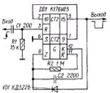 Аналогичный одновибратор можно собрать на одной микросхеме К176ИЕ5, К176ИЕ12или К176ИЕ18. Вариант одновибратора собранного на микросхеме К176ИЕ5 (рис. 1.4.3,г) работает так же, как описанный выше, но его генератор собран на инверторах, предназначенных для кварцевого генератора микросхемы. Для запрета его работы напряжение высокого уровня с выхода 15 (вывод 5) микросхемы подается на вход цепи инверторов генератора через диод VD 1. При подаче с выхода 15 на вход запуска импульса низкого уровня диод VD1 закрывается и не мешает нормальной работе генератора.