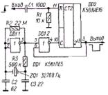 Схема варианта одновибратора на микросхеме К176ИЕ12, или аналогичной ей К176ИЕ18, приведена на рис. 1.4.3,в. Длительность формируемого импульса составляет 39х32768 = 1 277 952 периода импульсов генератора, поскольку сигнал высокого уровня на выходе М (вывод 10) появляется спустя 39 с после обнуления счетчика.