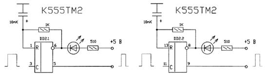 Рис. 1.4.4,(а, б) – Схемы одновибраторов (а – К555ТМ2 с элементом DD2.1, б – К555ТМ2 с элементом DD2.2)