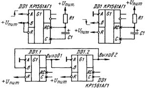 Одновибраторы микросхемы КР1561АГ1 обладают способностью повторного запуска. Если его условия повторно выполнятся во время формирования выходного импульса, длительность последнего увеличится на интервал времени между запускающими импульсами. Повторный запуск можно исключить, соединив вход B с инверсным выходом одновибратора, запуская его фронтом положительного импульса на входе A, или вход A с прямым выходом, запуская фронтом отрицательного импульса на входе B.