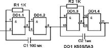 Схема простейшего одновибратора, выполненного на ТТЛ микросхеме приведена на рис. 1.4.1. Он запускается импульсом отрицательной полярности при нажатии на кнопку SB1 и формирует импульс длительностью около 0,5 мс отрицательной полярности.
