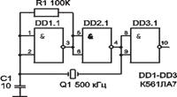 Инвертор DD1 3 с параллельно включенным резистором R4 предназначен для формирования в точке А импульсов напряжения, близких по форме к прямоугольным, и уменьшения тока через кварцевый резонатор. Так как резистор R2 уменьшает коэффициент запаса по возбуждению, то для того, чтобы компенсировать это уменьшение, применена местная положительная обратная связь через резистор R3.