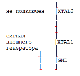 XTAL1 и XTAL2 являются входом и выходом инвертирующего усилителя, на котором можно собрать генератор тактовых импульсов. Можно использовать как кварцевые, так и керамические резонаторы. При подключении внешнего тактового сигнала вывод XTAL2 остается неподключенным, а XTAL1 подключается в выходу внешнего генератора.