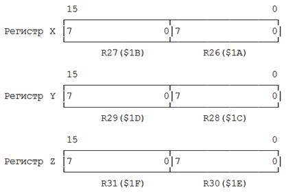 Шесть из 32 регистров можно использовать как три 16-разрядных указателя в адресном пространстве данных, что дает возможность использовать высокоэффективную адресную арифметику (16-разрядные регистры X, Y и Z). Один из трех адресных указателей (регистр Z) можно использовать для адресации таблиц в памяти программ. Это X-, Y- и Z-регистры.