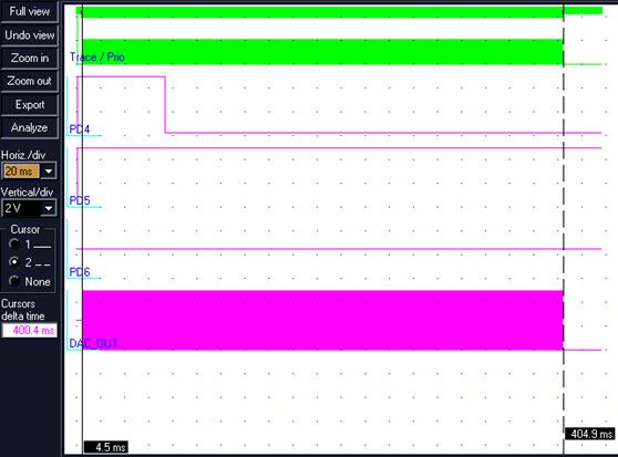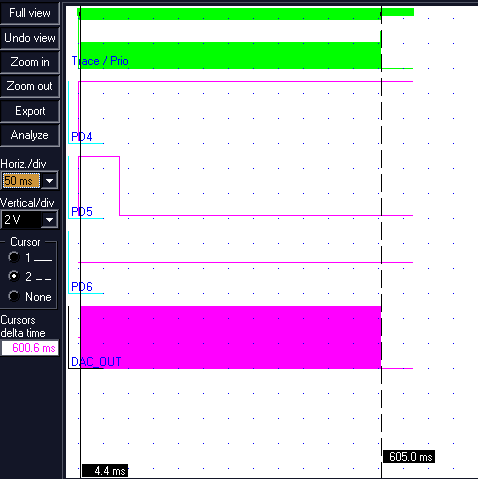 Проведем моделирование и отладку программы c помощью VMLab. Причем при моделировании используем макромодель 8 битного ЦАП, что позволяет наблюдать требуемые импульсы, измерять их длительность и амплитуду.