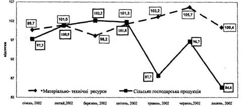 Рис.2. Динаміка індексів цін на сільськогосподарську продукцію та матеріально-технічні ресурси (11)