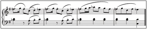 Побочная партия ритмически близка Главной и Связующей. Она в B-dur состоит из двух одинаковых предложений в верхнем и среднем регистрах.