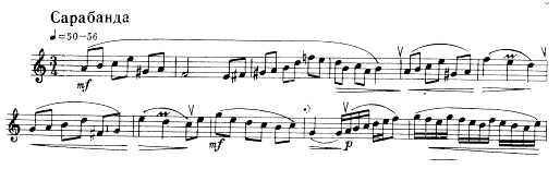 Третья часть, Сарабанда, построена на красивой и выразительной кантилене. Большая теплота и мягкость тембра создают мечтательное, прозрачное звучание.