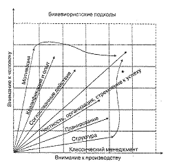 Сторонники "классической" теории полагали, что эффективность управления определяется формальной структурой управления, координацией и детализированным контролем, строгим соблюдением дисциплины, величиной индивидуального вознаграждения, узкой специализацией задач, единоначалием, авторитарными методами управления, правильным под бором кадров и орудий труда, соответствием людей структуре. Их противники доказали обратное: эффективность управления определяется неформальной структурой и прежде всего — малой группой, взаимодействием людей и общим контролем, само дисциплиной и возможностями творческого роста, коллективным вознаграждением, отказом от узкой специализации и единоначалия, демократическим стилем руководства, соответствием структуры людям, а не наоборот.