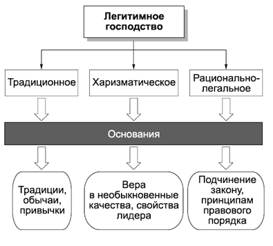 Понятие «легитимность», введенное в политологию М. Вебером, трактуется как правомочность власти, ее поддержка со стороны общества, проявление лояльности к власти со стороны граждан. Вебер утверждал, что характер легитимности власти (господства) определяет ее природу. Согласно веберовской теории, существуют три типа легитимного господства.