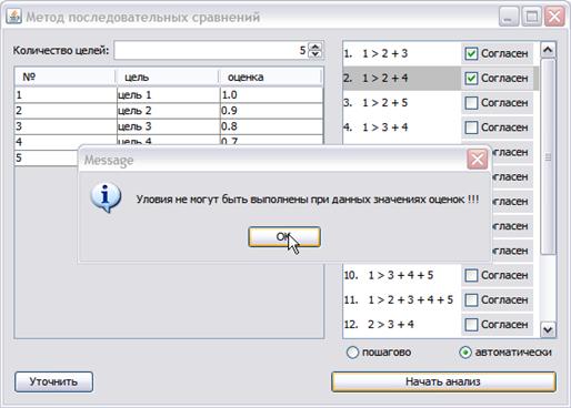 JOptionPane.showMessageDialog(this, (i + 1) + " правило не выполнилось. Скорректируйте оценки");