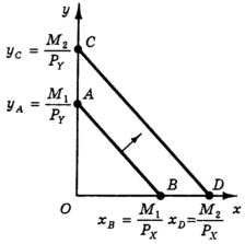 Зато изменились координаты точек пересечения бюджетной линии с осями координат: новая бюджетная линия пересекает ось y в точке С с ординатой yc = М2/PY, а ось x — в точке D с абсциссой xD = М2/PX.