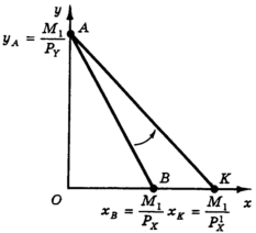 Если первоначальная бюджетная линия пересекает ось х в точке В с абсциссой xB = М1/PY, то “новая” бюджетная линия (при цене PX1 < PX пересекает ось х в точке K с абсциссой xk = М1/PX1. Иными словами, поскольку цена товара Х уменьшилась, потребитель может теперь, израсходовав весь свой доход на товар X, купить большее количество единиц этого товара. Таким образом, уменьшение цены товара Х приводит к повороту бюджетной линии против часовой стрелки вокруг точки пересечения бюджетной линии с осью y (а увеличение цены товара Х — к аналогичному повороту по часовой стрелке).