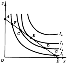 Как известно, наклоны двух линий в точке их касания равны. Следовательно, в точке Е наклон бюджетной линии равен наклону кривой безразличия.