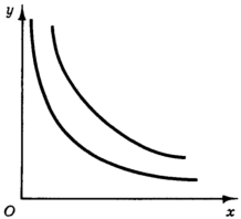 1. Кривые безразличия не достигают осей координат, а асимптотически приближаются к ним или к иным прямым, параллельным осям координат (рис. 6). Это означает, что сколь бы ни был велик объем потребления одного из товаров, он все же не может компенсировать полное отсутствие другого товара в наборе (иначе говоря, ни один из товаров не может быть полностью заменен другим, т. е. потребитель не может обойтись без какого-то количества каждого из товаров).