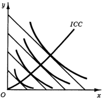 На каждом уровне дохода потребитель будет выбирать самый полезный набор благ, и можно сказать, что каждой бюджетной линии соответствует своя оптимальная точка. Если мы рассмотрим все возможные уровни дохода и соединим все точки выбора, соответствующие каждому уровню, то мы получим линию доход-потребление. По ней движется потребитель при изменении своего дохода (рис. 1).