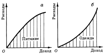 Рис. 2. Кривые доход-расходы на питание (а) и одежду (б).