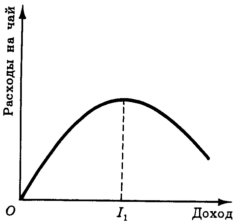На рис. 3 представлена линия доход-потребление некоторого потребителя для случая чай-кофе. Легко заметить, что эта линия на участке выше точки К поворачивает в направлении уменьшения потребления чая (в отличие от линий доход-потребление для пищи и одежды, изображенной на рис. 2). Такой поворот линии доход-потребление на рис. 3 означает, что при уровне дохода потребителя, превышающем уровень, для которого оптимальной комбинацией кофе и чая является набор K, чай становится низшим благом. На основе рис. 3 можно построить кривую Энгеля для расходов на чай (рис. 4).
