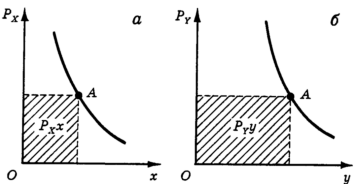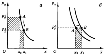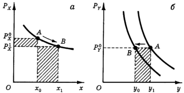 Итак, потребитель находится в точке А (рис. 15, а), покупая в единицу времени x0 товара Х по цене и y0 товара Y по цене (рис. 15, б). Когда цена Х внезапно падает с до , у потребителя появляется лишняя сумма денег, которой он может распорядиться. Этот выигрыш потребителя не зависит от формы кривой спроса, он полностью определяется исходным объемом потребления x0 и величиной падения цены (-). Но кривая спроса показывает, как он распределит высвободившуюся сумму. Посмотрите на рис. 15, а. Потребитель увеличивает расходы на товар X, переходя по кривой спроса из точки А в точку В. Заштрихованные площади на рис. 15, а показывают уменьшение расходов из-за снижения цены и их увеличение, связанное с покупкой дополнительного количества товара X.