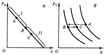 Но эластичность не остается постоянной на всем протяжении кривой спроса. На рис. 17 показана линейная функция спроса на товар X. Участок I характеризуется высокой эластичностью, и при снижении цены товара Х на этом участке кривая спроса на товар Y сдвигается влево. Но в точке В эластичность становится единичной и при дальнейшем движении продолжает снижаться, а кривая спроса на товар Y начинает смещаться вправо (участок II).